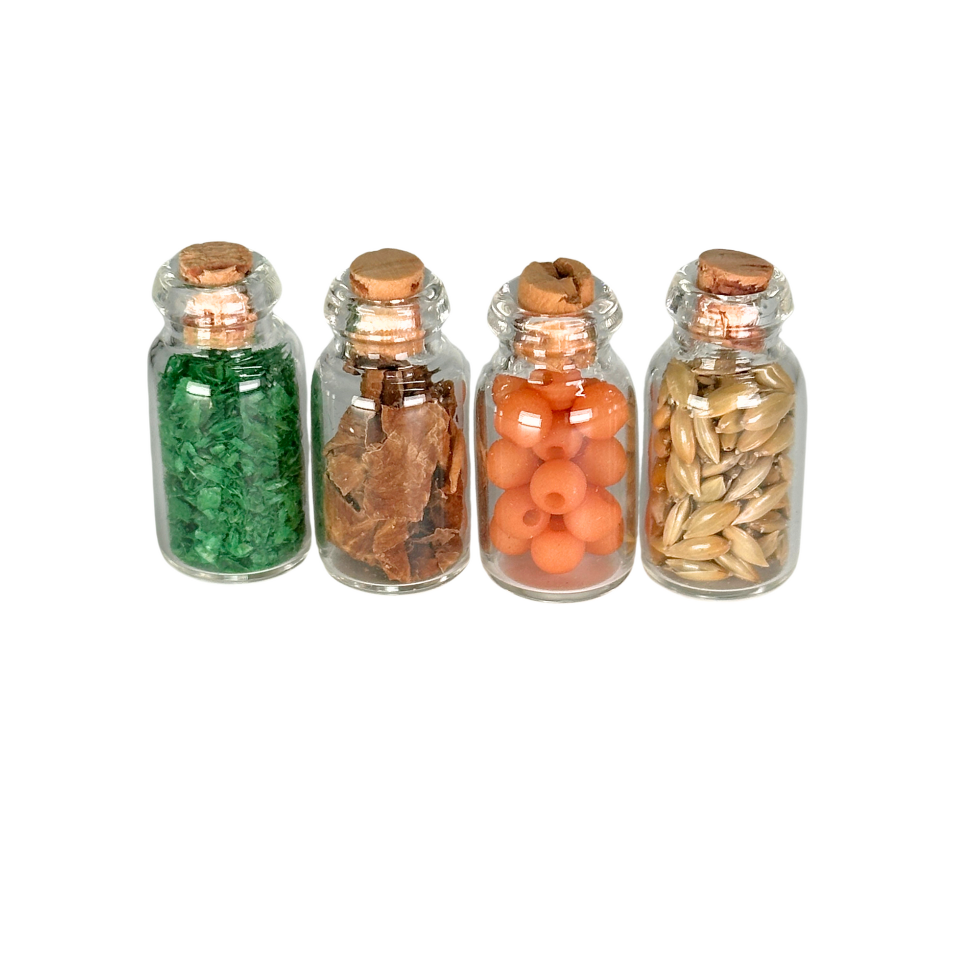 Du erhälst 4 unterschiedlich gefüllte Flaschen mit Korken.