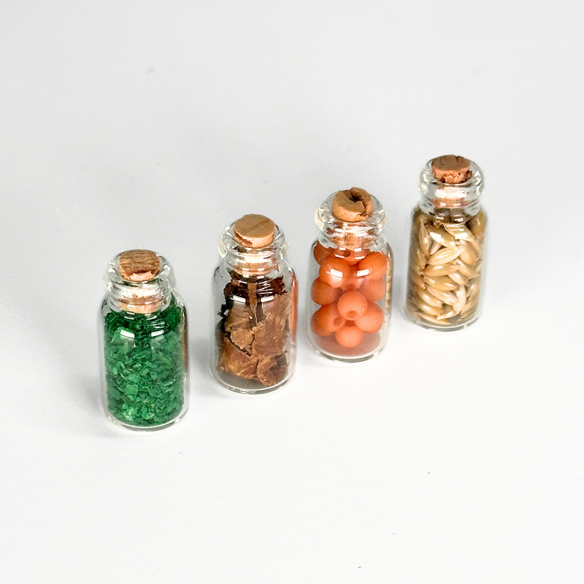 Gefüllte Fläschchen für den Schrank des Wichtels. Ein perfektes Zubehör für die Wichtelküche. Damit kann der Wichtel sicherlich leckere Dinge kochen.